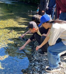 (左)小学校訪問でけん玉を教える/(右)ブッシュウォークにて野生のウナギを触る