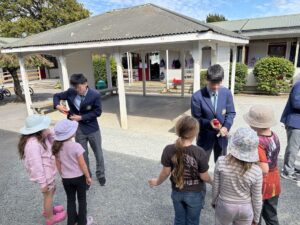 (左)小学校訪問/(右)国会議事堂前で説明を受ける