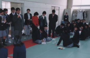 現「百人一首大会」などを見て回り、生徒や先生にいろんな質問をしてい