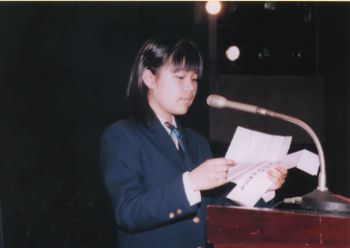 This day,having hopes and dreams for the future,we are entering "shibuya Makuhari Junior High School". It is very nervous to be standing here,but also very honorable being the representative of the first year students.I am excited that I can study with every one of my new friends at this school. I was living in the United States for about 6 years and of course I learned English there but I also learned that there were many different people in the world. People have different color eyes,hair,skin,and they all have different thoughts but they are all same people,and being different from other people is a good thing.I'm sure this school will maintain the importance of this point.