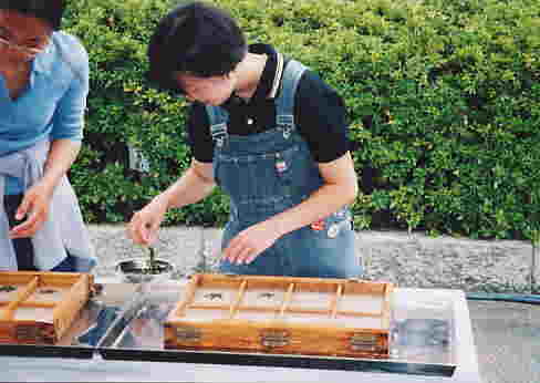 ![]() 吉野での 紙すき…こ れが私の選 んだ体験学 習だ。もち ろん紙すき なんて初め ての体験で、 不安は大きかったし、現地の 人々と直接ふれ合う数少ない機 会だったので、私は緊張してい た。しかしそんな私の心 配をよそに現地の方々は 皆、非常に気さくで、私 達にとても良くして下さ った。紙の作り方だけで なく、紙すきを次の世代 へ伝えていく事の大切さ も話して下さった。 体験学習を終えた私達 は、職業としての紙すきを 見学した。そこで見たおば あさんの後ろ姿に何か深い ものを感じた。幾度も幾度 も同じ作業を繰り返す。幾 度も幾度も、毎日毎日。普 段めまぐるしい変化の中で 生活している私には、「ず っと変わらないもの」が果 てしなく大きく感じられた。 長い間、積み重なって出来 るものが「伝統」と呼ばれ るのだろうと思った。 古都・奈良であるはずなの に、古いものばかり見たはず なのに、奈良には常に新鮮な 感動があった。それは、私の 日常生活の中に「伝統」と感 じられるものが、あまり無い からだと思う。私達は、新し いものの良さはよく知ってい る。しかし、古いものの良さ をあまりに知らなさすぎる。 私は紙すきの体験を通してこ の事を知る事ができた。 また、古い歴史に触れる事 によって、ただただ自分が生 きてきた時間の短さ、自分の 卜存在のあっけなさを感じた。 本当にたくさんの事を吸収 した奈良研修であったと思 う。