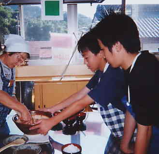 ![]() 又、歩いていて少し驚いたの が、紅葉だ。葉が本当に真っ赤 だった。それをきっかけに周り に気を付けて見ると、色々な植 物の姿があった。葉が枯れては げかかった木、見かけない花、 とんでもなく大きいコスモス。 そんな光景を見ていると、植物 が私達を歓迎しているようで気 分が良かった。ふと何気ない所 に目をやるのも楽しいと思った。 歓迎してくれたのは自然ばか りではない。地元の人々も手厚 く迎えてくれた。まず、観光案 内の人。道を尋ねたら、とても 親切に教えて頂いた。すれちが うお年寄りも目が合えばにこっ と笑ってくれて「どこから来た の」「木曽は良い所でしょう」と 話しかけてくれた。体験学習先 の主婦も「五平餅はねぇ、木曽 の伝統的な文化を受け継いでい るんだよ」と優しく指導してく れた。本当に素朴な会話だが、 不思議と心が丸くなった。