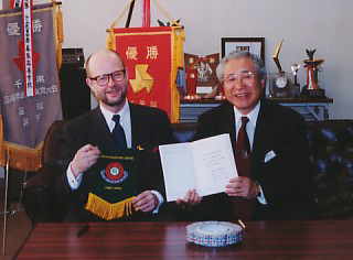 北欧フィンランドはIT先進 国。外務省の先進国招聘事業に より来日中のジャーナリスト、 T・ルオカネン氏が教育視 察を目的に来校された。氏は同 国の知識人向け週刊誌にて編集 長をなさり、代表的文化人のお 1人。たいへんな日本通で教育 事情にも関心を有し、ITと教 育、民間と学校教育の連携など が話題となった。田村校長から 日本の文化背景が歴史的に述べ られ、明治から敗戦を経て現在 に至る教育の変遷を整理した上 で、今後日本社会に求められる ものはかつて来日したペリー提 督が、歴史学者シェリーマン が、そして作家ラフカディオ・ ハーンが高く評した日本人の職 業、さらには人生そのものに対 する矜持の回復であるとの解 説。英語による直接対話は熱の こもったものであった。その後 校内巡見にて社会人講師の文章 指導、マルチメディア、中学の ディベート授業などを見た後、 茶道部により茶の湯に招かれ、 初の体験に一期一会の感動を強 く表しておいでだった。