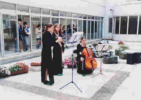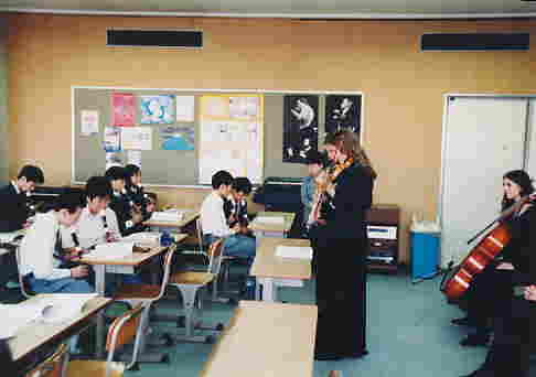 10月16日、アメリカ・コ ロラド州より「ボルデー・ ユースオーケストラ」のメン バーが来校しました。『日米 草の根サミット』の招きで来 日したもので、団員は14・ 5才が中心の若いオーケスト ラです。指揮者を含め5名が 訪れました。このサミットは、 市民レベルでの交流を目的と したもので、毎年日米で交互 に開催されています。今年は 千葉県が開催地となり、全県 各地で様々な行事が行なわれ ました。本校でのプログラム は、同世代の若者と触れ合い たいというメンバーの強い希 望により実現したものです。 その言葉通り、中学1年生と の音楽交流では、歓迎の歌や リコーダーの音色に合わせ即 興で演奏に加わり音楽の輪が 広がりました。その後、帰国 生の授業にも参加、また昼休 みには、高校棟1階ライト コートでミニコンサートも行 なわれ、多くの生徒がその音 色を楽しみました。校内では、 笑顔を送る生徒や話しかける 生徒もおり、文字通り草の根 の交流になりました。