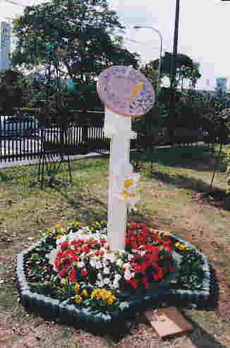 講堂前のバラ ゾーンに、日時計 花壇ができまし た。 日時計は、変 形コマ型の精密日 時計です。アクリ ル円盤は、日時 計の文字盤です。 文字盤から2本 の小さい板が直立 しますが、1つに は、アナレンマ (1年間にわたる、 同時刻の太陽の位置)が描か れ、もう1つには、太陽光を通 すピンホールが開きます。使い 方は、ピンホールを通過した太 陽光のスポットをアナレンマの 線に合わせます。現在の時刻 は、文字盤底の時計の針(バラ の絵の右上あたり)の位置の時 刻に示されます。 この日時計の一番の特長は、 ウェルカムボード(歓迎の意を 表す表示板)で、ウェルカムの 文字とともに、バラの絵とロン サールのバラの詩の一節も書か れています。ロンサールは、「バ ラは神々の香り、バラは乙女の 誇り。」とうたいます。第2の 特長は、日時計の内部に極軸望 遠鏡を内蔵したので、高い精度 で日時計を設 置できること です。第3の 特長は、材料 の大半は、校 内か我が家に あった余りも のや廃棄物を 用いて製作し た事です。 第4の特長 は、日時計そのものは、長雨など の天候不順を考えて、台座から 容易に取り外しができるつくり にしてある点です。その時は、日 時計の代わりに、ギリシャ、ロー マ風の素焼きの鉢に季節の花を 盛って台座に置くつもりです。 よく晴れた日には、バラゾー ンにお入りいただき、のんびり とバラを眺め、日時計を回して みて下さい。
