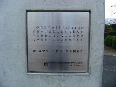 個人、法人、団体を含め188件の義援金は総額6,051,795円となり、校門の復旧工事その他に利用させて頂きました。勝手ではございますが、ご支援賜りました皆様への感謝の気持ちを表し、校門脇支柱に記念プレートを埋め込むこととし、11月5日に記念プレートの設置並びに除幕式を行っておりますので、重ねて御礼申し上げます。