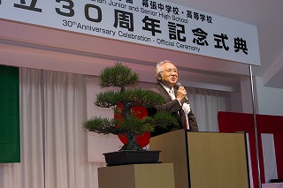 去る十月二十九日火曜日午後、渋谷教育学園幕張中学・高等学校の開校三十周年記念式典が、本校第二啓発室を会場に挙行されました。また式典の後、三十周年記念として建設されたメモリアルタワーを中心に校舎見学会を行い、その後祝賀会を第一体育館にて開催しました。 森田健作千葉県知事及びロングボトム英国公使(学園理事)よりお祝いの言葉を頂戴しました。また、松崎秀樹浦安市長、吉田晋日本私立中学高等学校連合会会長、大羽克弘千葉県私立中学高等学校協会会長など、多数の県内高校関係者並びに工事関係者の皆様、本学園理事の上野尚一朝日新聞社社主、髙梨兵左衛門キッコーマン株式会社特別顧問を始め、歴代の教育後援会会長と教育後援会評議員の皆様を含む、多数の学園関係者にもご参列を頂き、盛会のうちに終えることができました。 また、海外研修でお世話になっている、ニュージーランド、中国、シンガポールの各学校の先生方もご来校頂き、お祝いの言葉を頂戴しました。 今般寄贈頂いた校長の胸像が、前日の十月二十八日に除幕式が行われ、メモリアルタワー一階の図書館入口脇に無事設置されました。 三十年に亘る本校の歴史を改めて振り返るとともに、これまで色々とご支援賜りました関係の皆様に感謝申し上げたいと思います。今後の更なる学校の発展と、ご参列賜りました皆様のご多幸ご健勝を祈念しつつ、この場を借りて重ねて御礼申し上げます。