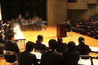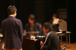 今回で十九回目となる模擬裁判が十一月二十七日に本校講堂で行われました。模擬裁判は司法制度への理解を深める目的で、中三を対象に毎年行っています。今年も東京弁護士会法教育センターに所属する十一名の弁護士の先生方をお迎えし、リハーサルと本番の二回にわたり直接ご指導をいただきました。配役は多数の希望者の中から選ばれた二十七名の生徒が担当し、その他の生徒は公民の授業内で読み込んだ資料をもとに、傍聴席で審理を見守りました。 |