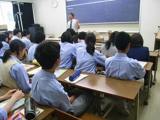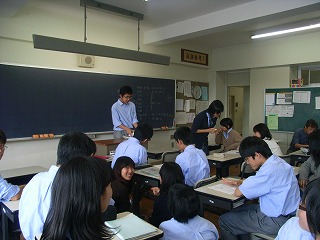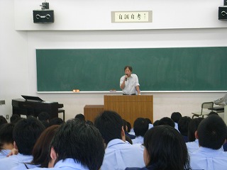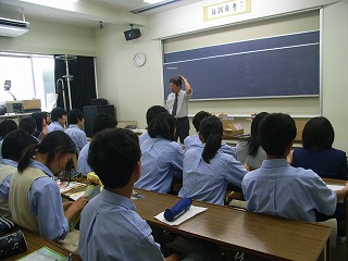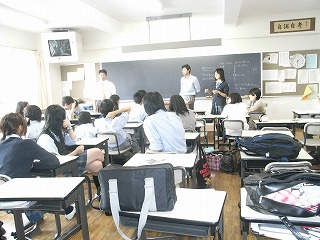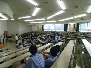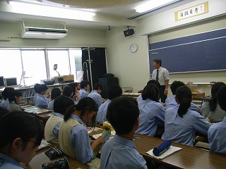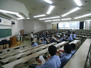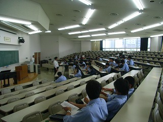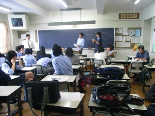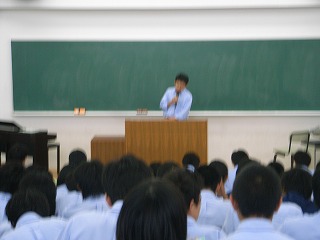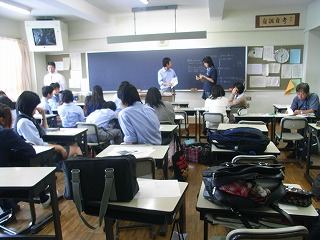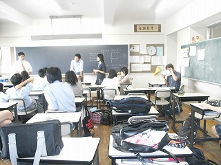 研修前日は、行動で中1、中2、高1、3学年合同の結団式を行いました。 結団式終了後、高校1年生は啓発室に移動し学年集会を行い、研修についての最終確認を行いました |