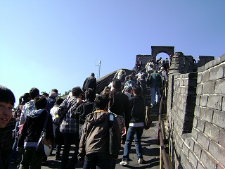 | いよいよ待ちに待った万里の長城です。北京ではこれほど快晴の日は珍しいそうです。雨天だとかなり上るのがつらそうです。 | ![]() |