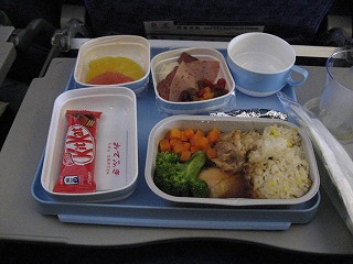| 機内食は「牛肉の麺」か「鶏肉のご飯」をチョイスするものでした。16時くらいに出されたので、昼御飯には遅く、晩御飯には早かったのですが、おいしかったため、生徒は皆しっかりと食べていました(もちろん晩御飯もしっかり食べていました)。 | ![]() |
