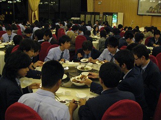 | 燕翔飯店の様子です。比較的あっさりした味だったので、生徒も箸が進みました。しかし、黒酢のスープには少々抵抗を感じる生徒もいたようです。 | ![]() |