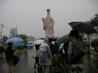 兵馬俑坑の様子です。兵馬俑坑は始皇帝陵の一部であるため、入口には巨大な始皇帝像が建てられています。 |
