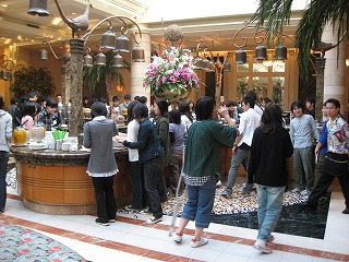 北京龍城麗宮国際酒店の朝食の様子です。ビュッフェスタイルで、生徒は自分で好きなものを好きなだけとることができます。自分で具を選択して、その場で作ってくれるオムレツが好評でした。 |