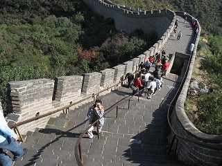 | 万里の長城です。「男坂」と「女坂」があり、生徒はどちらかを選択して登ることができました。「男坂」の方はかなり急な坂道もありましたが、果敢にも挑戦する女の子も多数いました。 | ![]() |