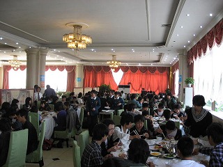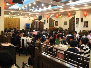 夕食の千喜酒楼です。一日よく歩き、運動したせいか、生徒もしっかりと食事をとっていました。また、ここでの食事は生徒の口にもよく合ったようで、大変好評でした。 |