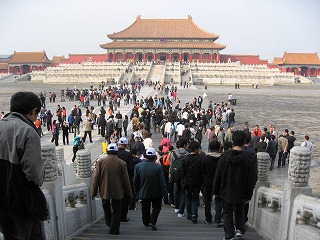 故宮博物院です。正面に見えるのは太和殿です。中央の広場に木がないのは、「口」の形をした広場の中に「木」があることによって「困」った事態を避けるためだそうです。 |