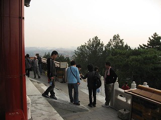 | 故宮博物院見学後、珍宝館・時計館・養心殿・景山公園の4つのコースに別れて見学しました。写真は景山公園の様子です。故宮博物院の全体を見渡すことができます。 | ![]() |