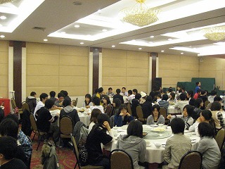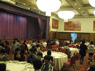 夕食の瀟湘苑の様子です。西安から北京での機内食をしっかり食べてしまった生徒は、ここでの食事はつらかったかもしれません。料理自体は日本人にも食べやすい味だったと思いますが。 |