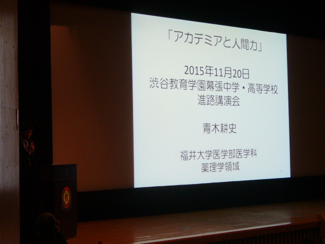 | 本校7期卒業の現福井大学医学部医学科薬理学領域の教授でおられる青木先生に講演をしていただきました。「アカデミアと人間力」と題しての講演は進路を考える本校生徒に大変良い刺激を与えていただけました。 |