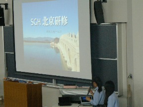 | 啓発室にて希望者を対象に短期海外研修についての説明会が行われました。 冬季、春季休業中に海外(中国、ベトナム、シンガポール、イギリス)へ短期留学した生徒から現地での様子の発表がありました。 |