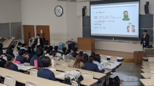 法学教室では「窃盗罪から学ぶ法学入門」をテーマに、誰かが置き忘れた私物を持ち去る行為が窃盗罪にあたる場合とそうでない場合の違いについて、参加者自身が検討した上で法学的発想を学びました。双方向的にやりとりをしながらの授業で、生徒からも様々な考察が飛び出す活気ある講義でした。