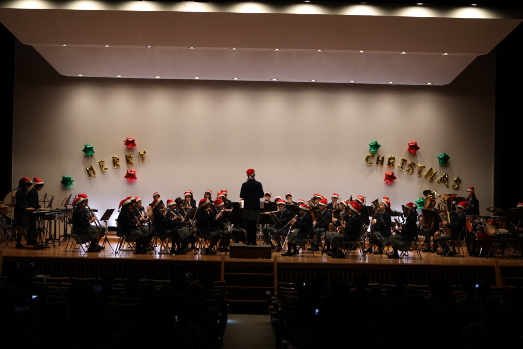 中学吹奏楽部クリスマスコンサート 2025年12月22日2025年12月22日 恒例の中学吹奏楽部によるクリスマスコンサートが開催されました。 のりのりの「クリスマスディスコキャロル」から始まり、今年流行したドラマやアニメの主題歌がつづられた「Best Hit Medley 2025 & 第九Brass Rock」まで、全4曲を終業式が終わった解放感とともにクリスマス気分たっぷりに演奏してくれました。